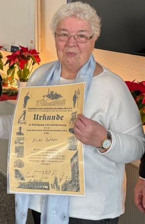 Die Rheinhauser Bergbausammlung trauert um Erika Bathen, ein langjähriges verdientes Mitglied. Sie verstarb am 23. Juli im Alter von 78 Jahren. Noch im letzten Dezember konnten wir sie im Rahmen der Barbarafeier mit Urkunde und Silbermedaille ehren.
