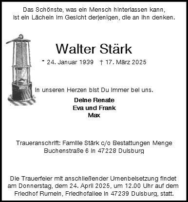 Die Beisetzung findet am 30. April auf dem Parkfriedhof in Duisburg-Homberg statt.