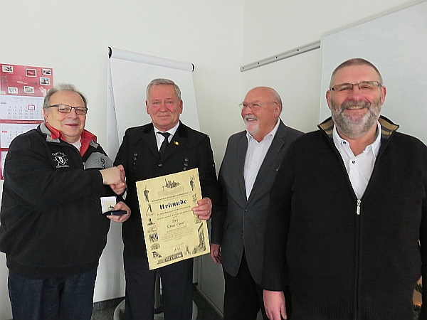 Urkunde und Silbermedaille überreichten (von links) der Vorsitzende Wilfried Brücksken, der stellvertretende Vorsitzende Heinz Schüler sowie der stellvertretende