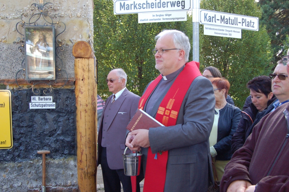 Pfarrer Andreas König von der Gemeninde St. Marien segnete die in einem kunstvoll geschmiedenen Fach angebrachte Heilige Barbara, die Schutzpatronin der Bergleute.