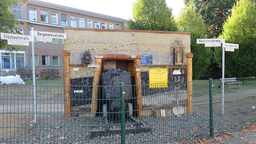 Die Rheinhauser Bergbausammlung hat im April 2003 zur Erinnerung an die Schachtanlage Mevissen am alten Standort der Fördergerüste an der Geitlingstraße