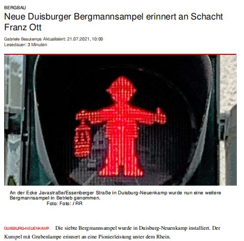 Eine neue Bergmannsampel wurde am 21. Juli übergehen in Duisburg-Neuenkamp in der Nähe des ehemaligen Schachts Java (Ecke Javastr./Essenberger Str.) in Betrieb genommen. Der Schacht gehörte zur Zeche Diergardt-Mevissen. Den Artikel können Sie hier lesen. Er öffnet sich in einem neuen TAB.