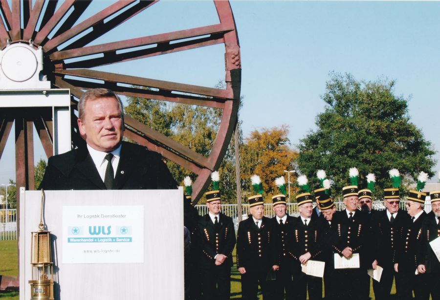 Auf dem ersten Bild sieht man neben der Seilscheibe den Knappenchor Rheinland und den Vorsitzenden der Rheinhauser Bergbausammlung, Wilfried Brückscken,