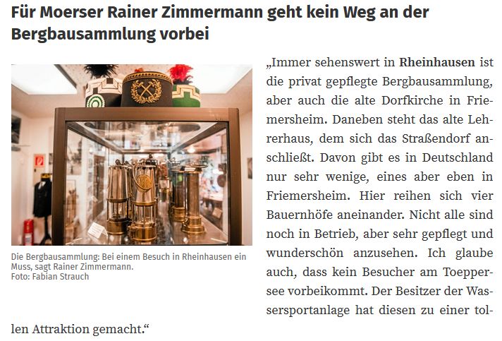 In den Lokalteilen von WAZ und NRZ erschien in der letzten Woche eine weitere Folge der Serie "Ferien: Das sind die Lieblingsziele der Duisburger und Moerser". Erwähnt wurde u.a. die Rheinhauser Bergbausammlung.