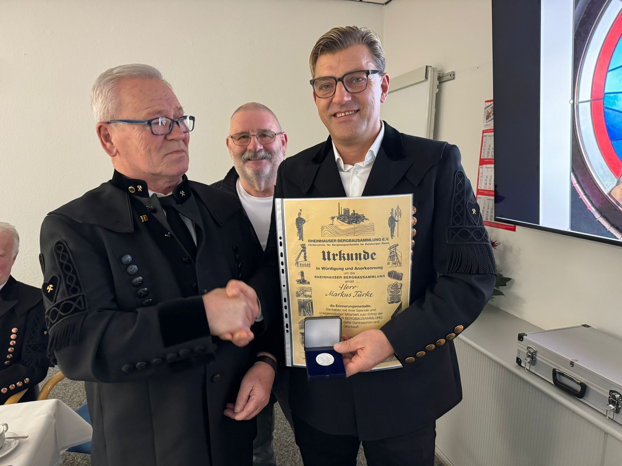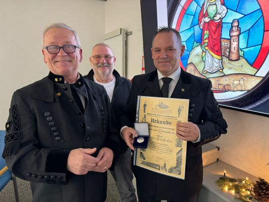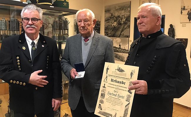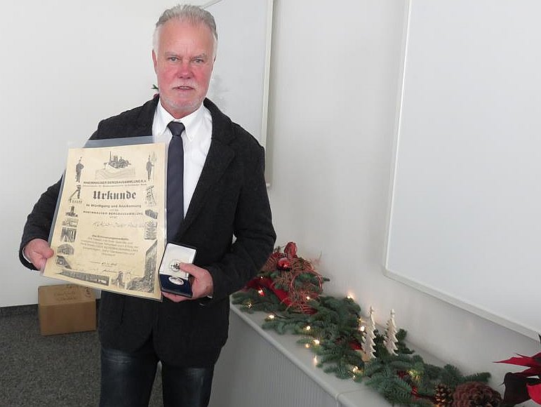 Traditionsgemäss haben wir am 4. Dezember, im Rahmen der Barbarafeier, ein verdientes Mitglied geehrt. In diesem Jahr war es Hartmut Hertel. Als ehemaliger Steiger auf den Zechen Diergardt-Mevissen und Rossenray kann er von einer mehr als 70-jährigen Mitgliedschaft in der Gewerkschaft IG Bergbau, Chemie, Energie berichten. Als langjähriges Mitglied unseres Vereins und der finanziellen Unterstützung in diesem Jahr hat sich Hartmut Verdienste um unseren Verein erworben. Als Auszeichnung überreichte ihm die Rheinhauser Bergbausammlung eine Urkunde und eine Silbermedaille.