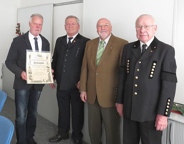 Die Rheinhauser Bergbausammlung feierte den Barbaratag am 4. Dezember traditionsgemäß in den Caritas Werkstätten Niederrhein in DU-Rheinhausen. Dabei werden verdiente Mitarbeiter geehrt. Dieses Jahr fiel die Wahl auf Klaus-Dieter Pawellek aus DU-Rheinhausen. Auf dem ersten Bild zu sehen, von links nach rechts, Klaus-Dieter Pawellek, Wilfried Brücksken, Dieter Bathen und Bernhard Fritsch.