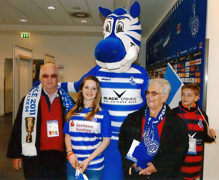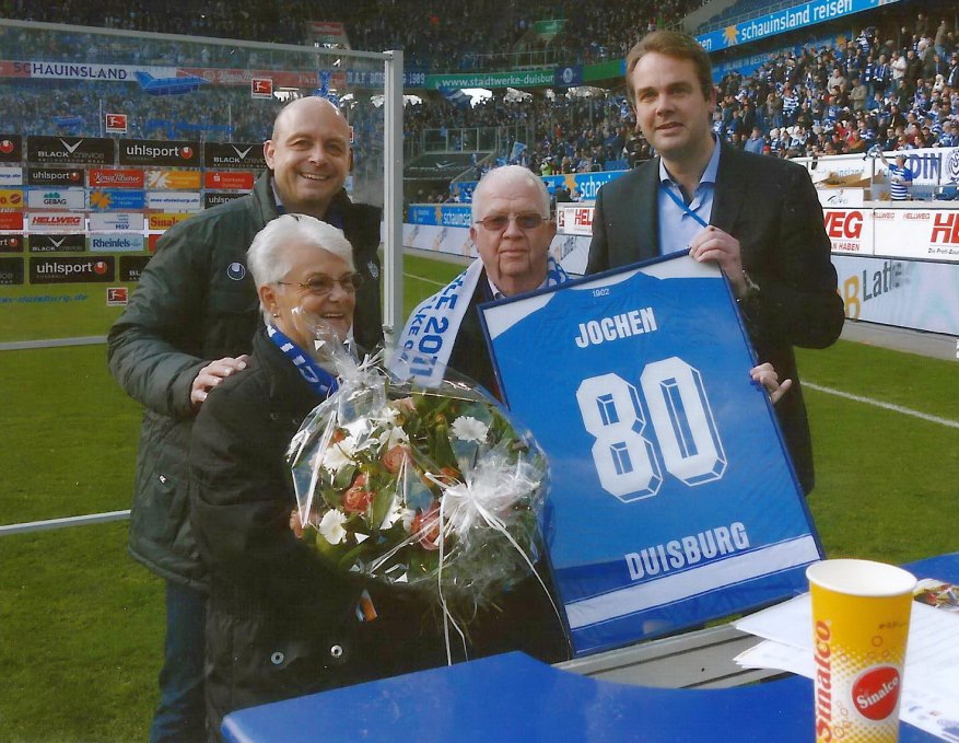 Vor über 14.000 Zuschauern und laufender Kamera gratulierte der MSV-Geschäftsführer Mohnhaupt zum 80. Geburtstag und bedankte sich für über 20-jähriges Engagement, Hilfe bei kreativen Wünschen, „Zebrastreifen Fan – Kunst " und vor allem für Entwurf und Gestaltung des offiziellen MSV-Zebra-Logos in den 90er Jahren. Als Geschenk erhielt Joachim Schulze ein MSV-Heimtrikot mit dem Aufdruck Jochen 80. Seine Frau Brigitte freute sich über den schönen Blumenstrauß. Viele MSVer, Fans und Legenden u.a. Bernhard Dietz gratulierten. Eingefädelt hatte die ganze Aktion Sohn Andreas Schulze, übrigens auch eines unserer Gründungsmitglieder.