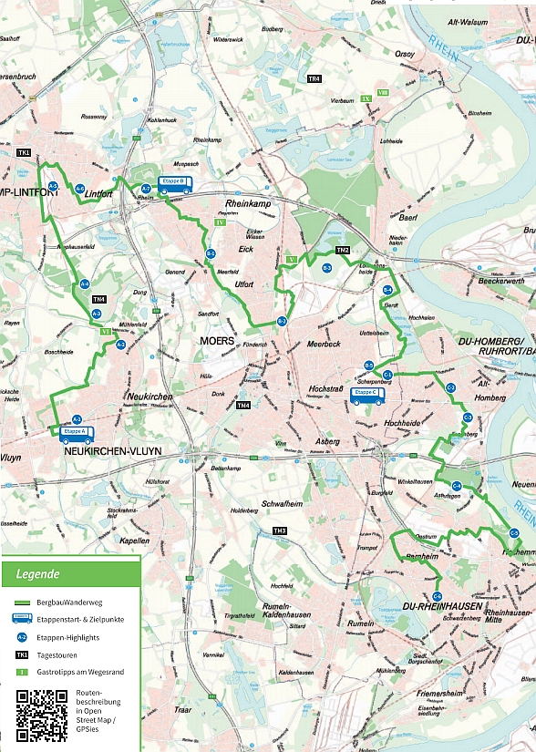 Vom Start am ehemaligen Bergwerk Niederberg in Neukirchen-Vluyn geht es vorbei an weiteren früheren Bergwerken und Bergehalden durch Kamp-Lintfort, Moers, DU-Homberg zum Endpunkt,