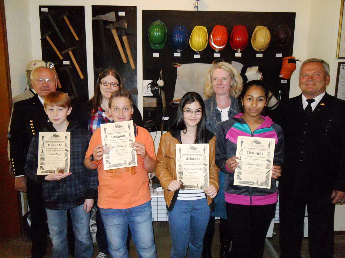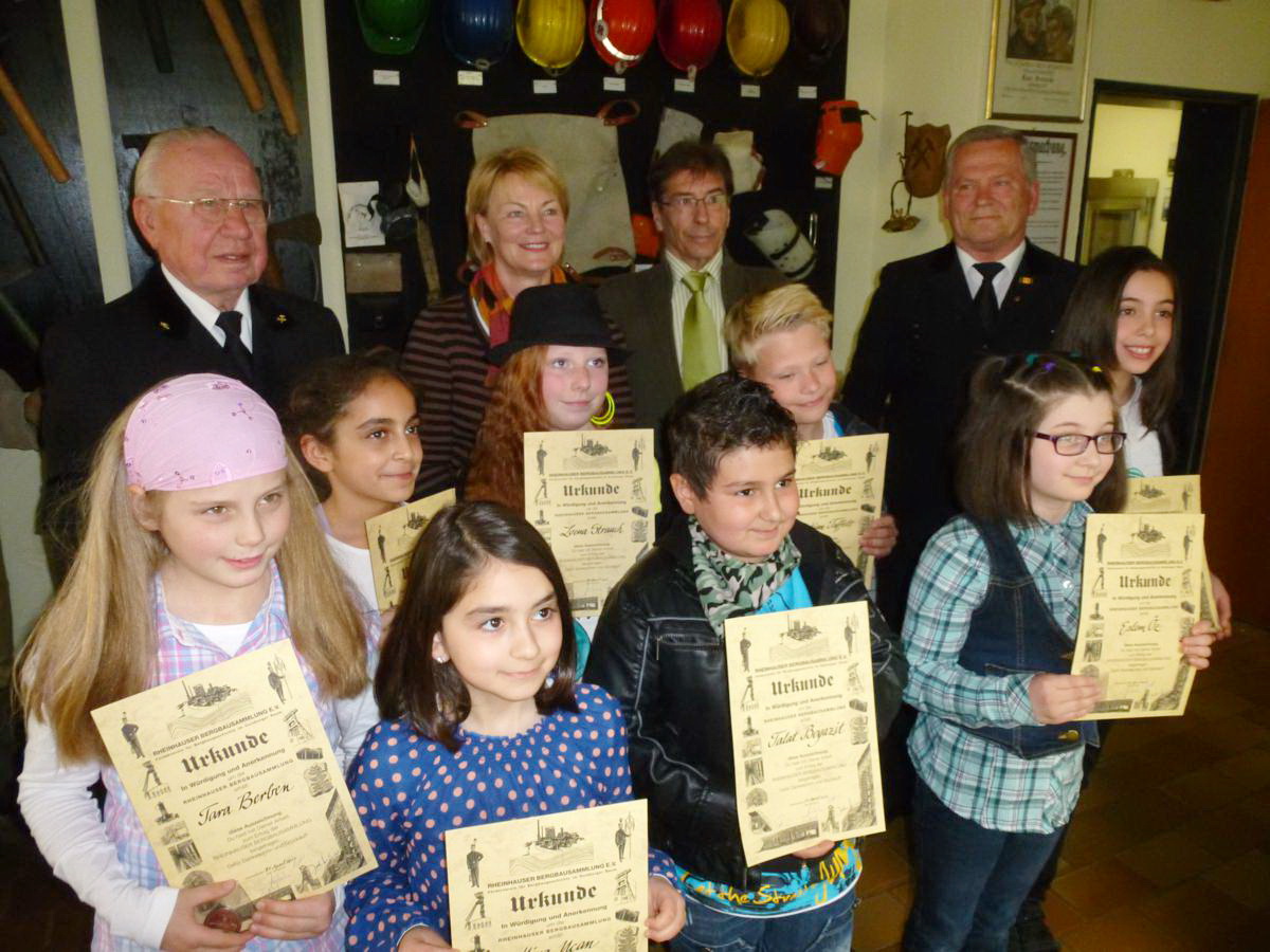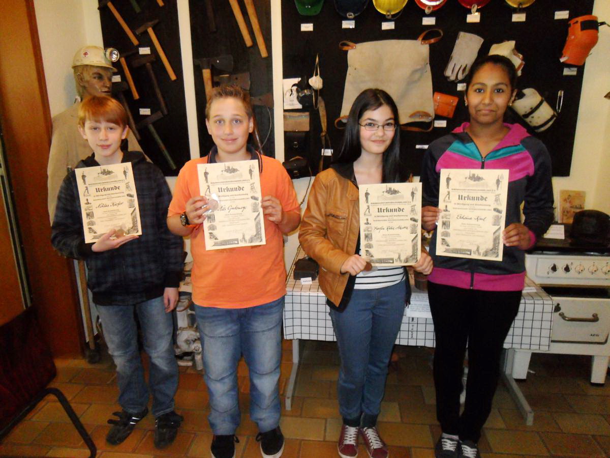 Die besten wurden ausgezeichnet. Von links vorne Niklas Kiefer, Nils Gudenoge, Berfin Rabia Akcora und Scheina Kaul. Hinten Bernhard Fritsch und Wilfried Brücksken von der Bergbausammlung sowie die
