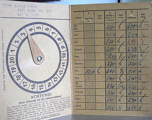 Die abgebildete Lohnkarte stammt aus der Zeit, als 2x monatlich Bargeld ausgezahlt wurde (Abschlag und Restlohn). Als Sicherung gegen Missbrauch hatte jeder Bergmann eine Geheimzahl, welche er kurz