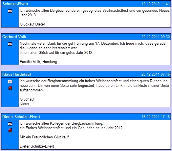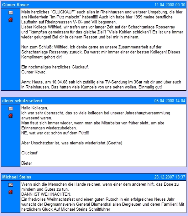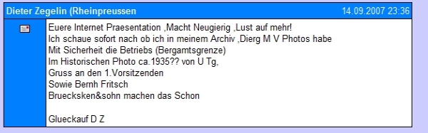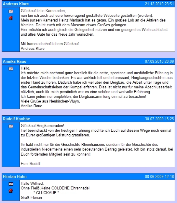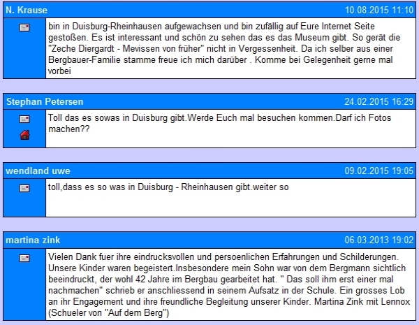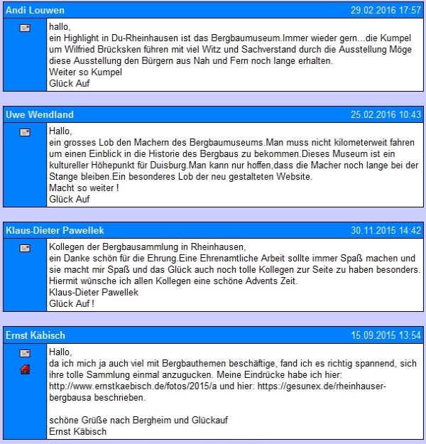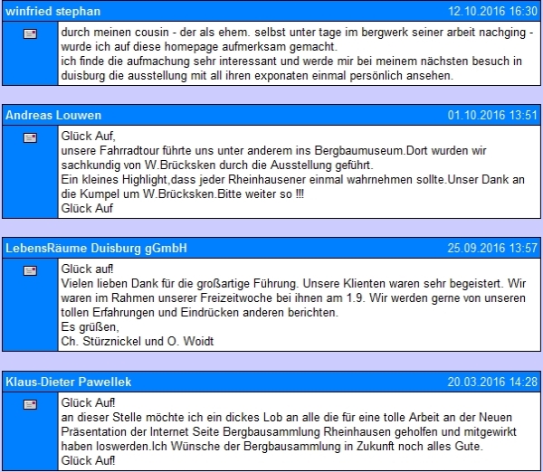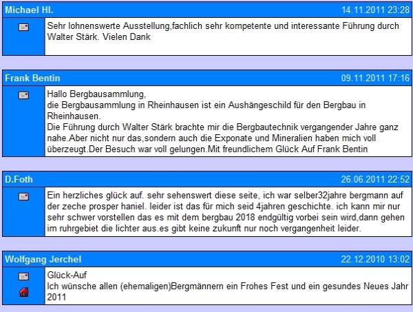 Hier haben Sie die Möglichkeit mitzuteilen, wie ihnen die Rheinhauser Bergbausammlung gefallen hat. Klicken Sie auf "Eintragen".Bitte haben Sie Verständnis dafür, dass alle Einträge vor der Veröffentlichung geprüft werden.